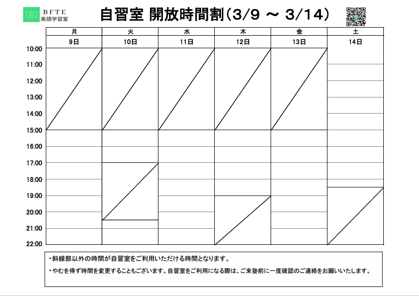 今週(3/9~3/14)の自習室 開放時間割表です!